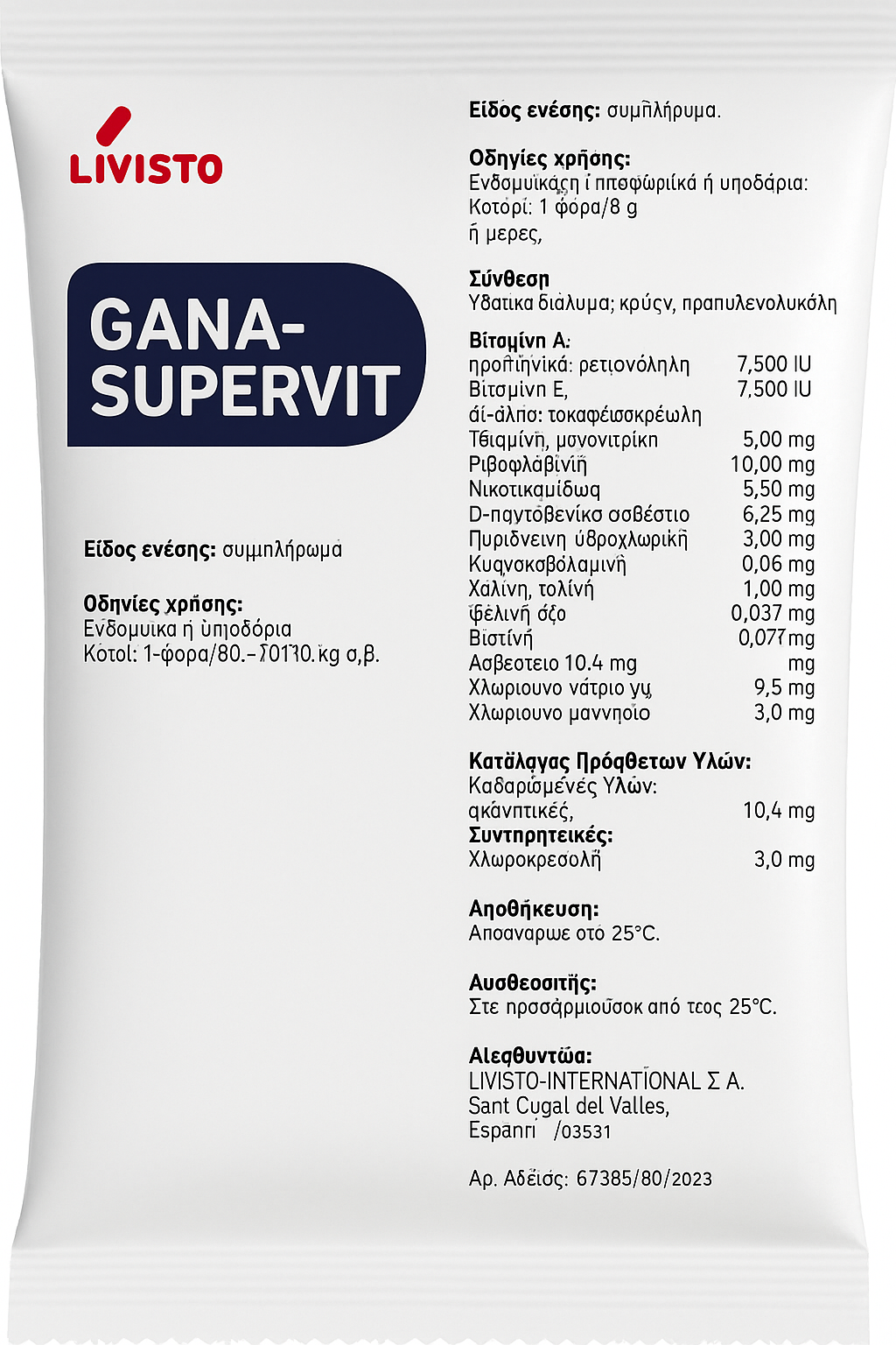 Χορηγείται στην τροφή ή σαν υδατοδιαλυτό συμπλήρωμα.